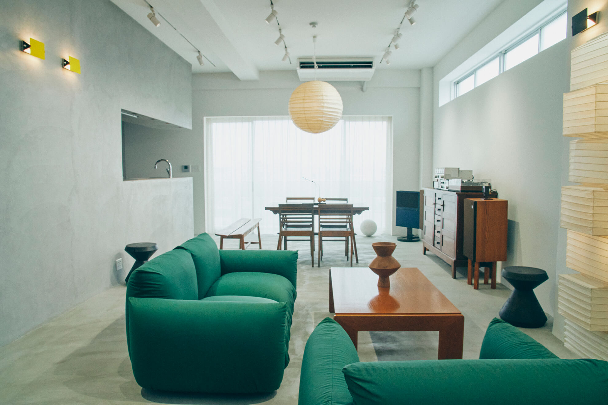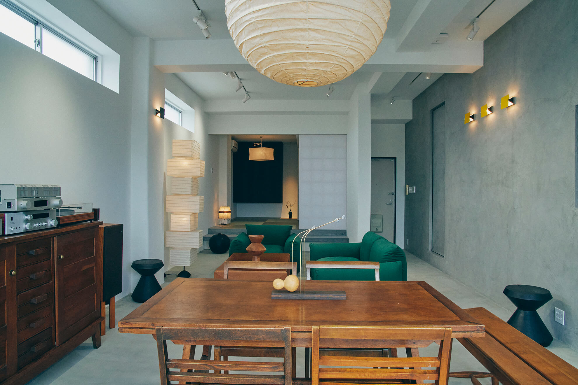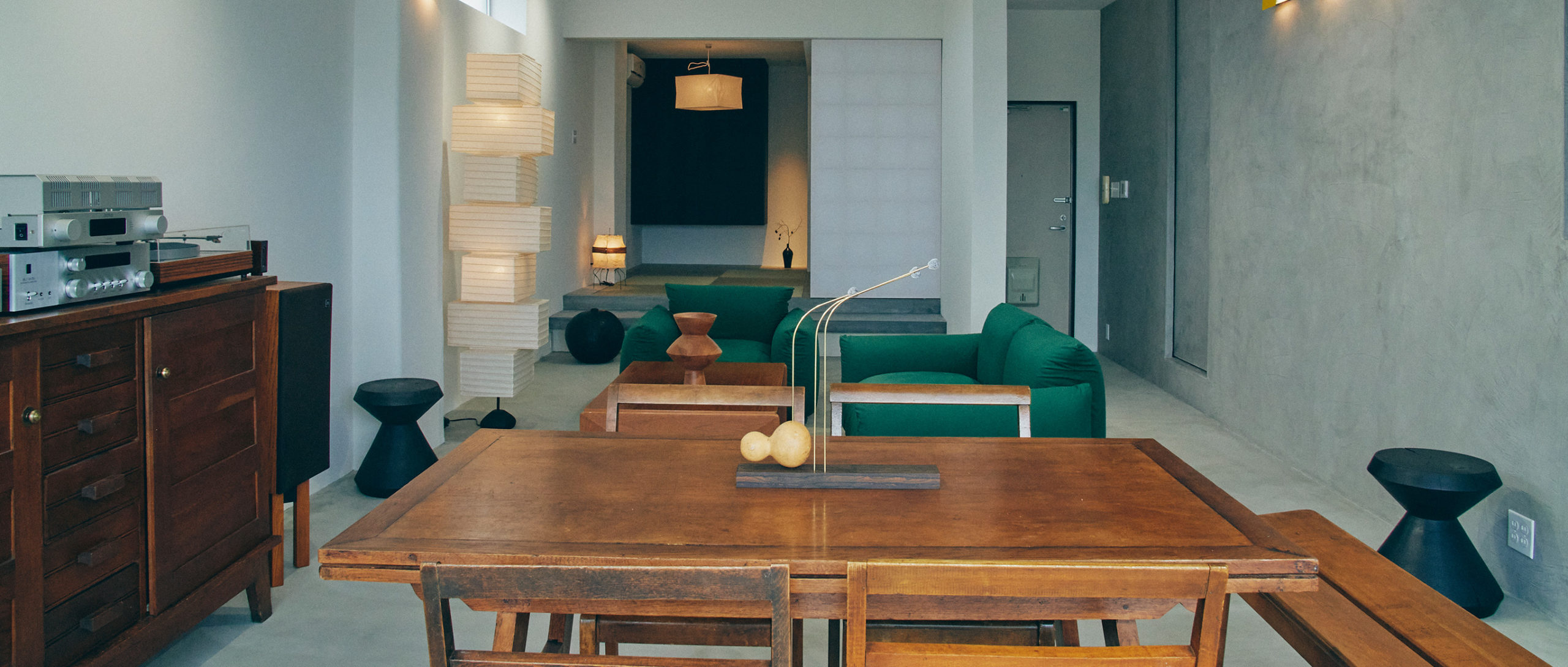 In a sterile space unified by gray tones, warmth is introduced through the interior design. The sofa is by Marenco, while the beautifully aged wood textures of the table, chairs, and cabinet are by René Gabriel. Isamu Noguchi's AKARI and Charlotte Perriand's wall lamp create a coordinated look that transcends genres.