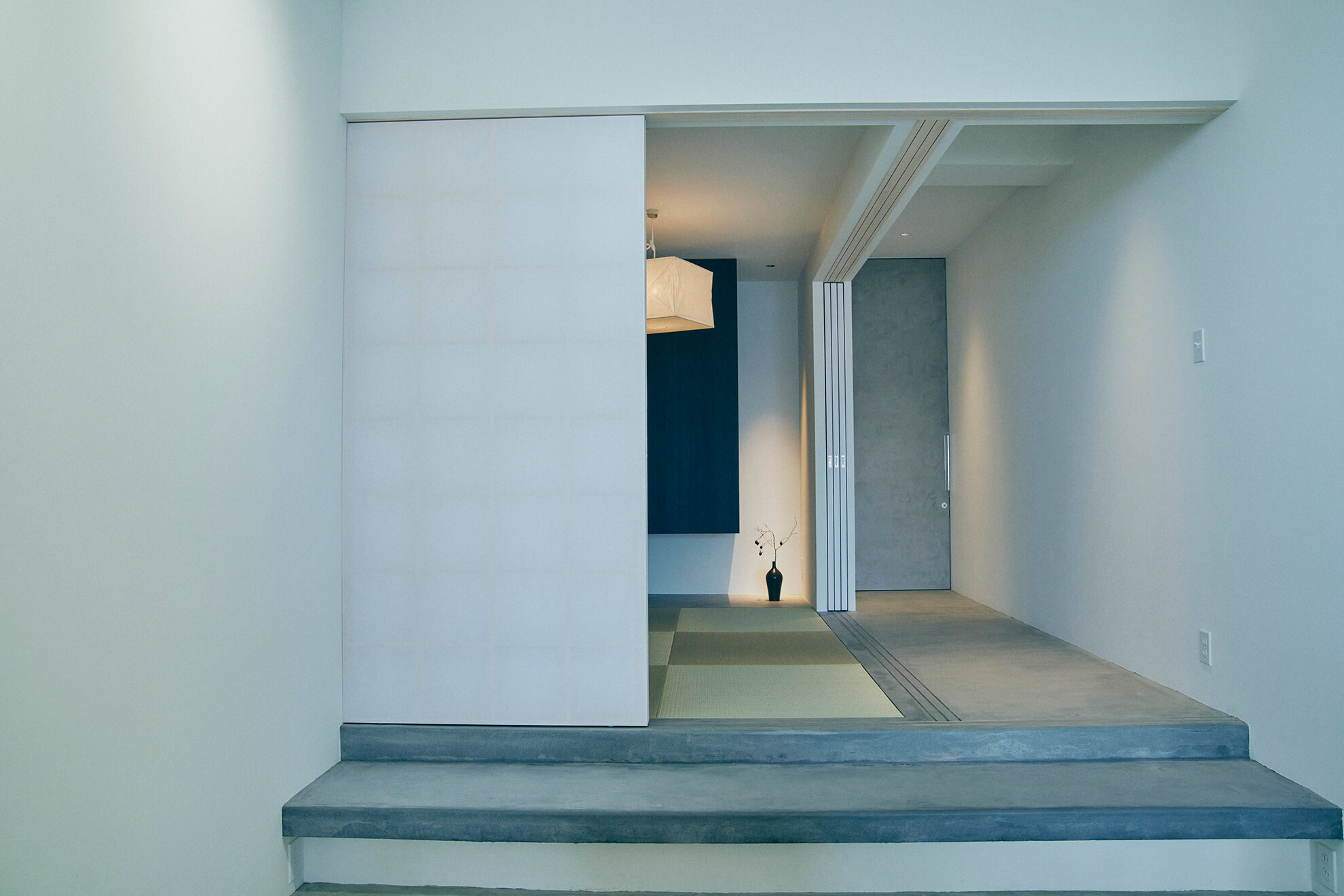 The foreground serves as a living and work space, while the area at the back, separated by shoji screens, contains the tatami room and bedroom.