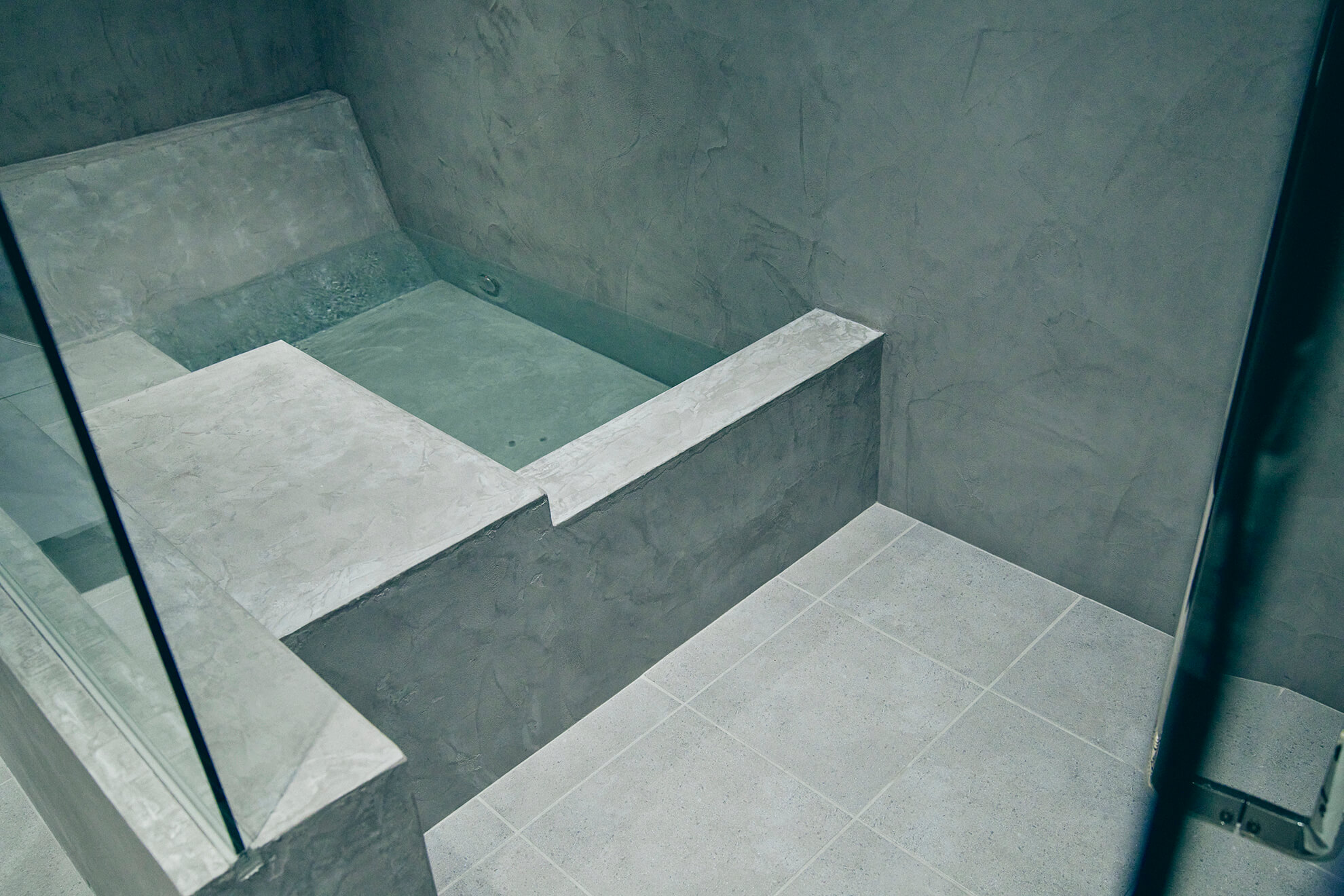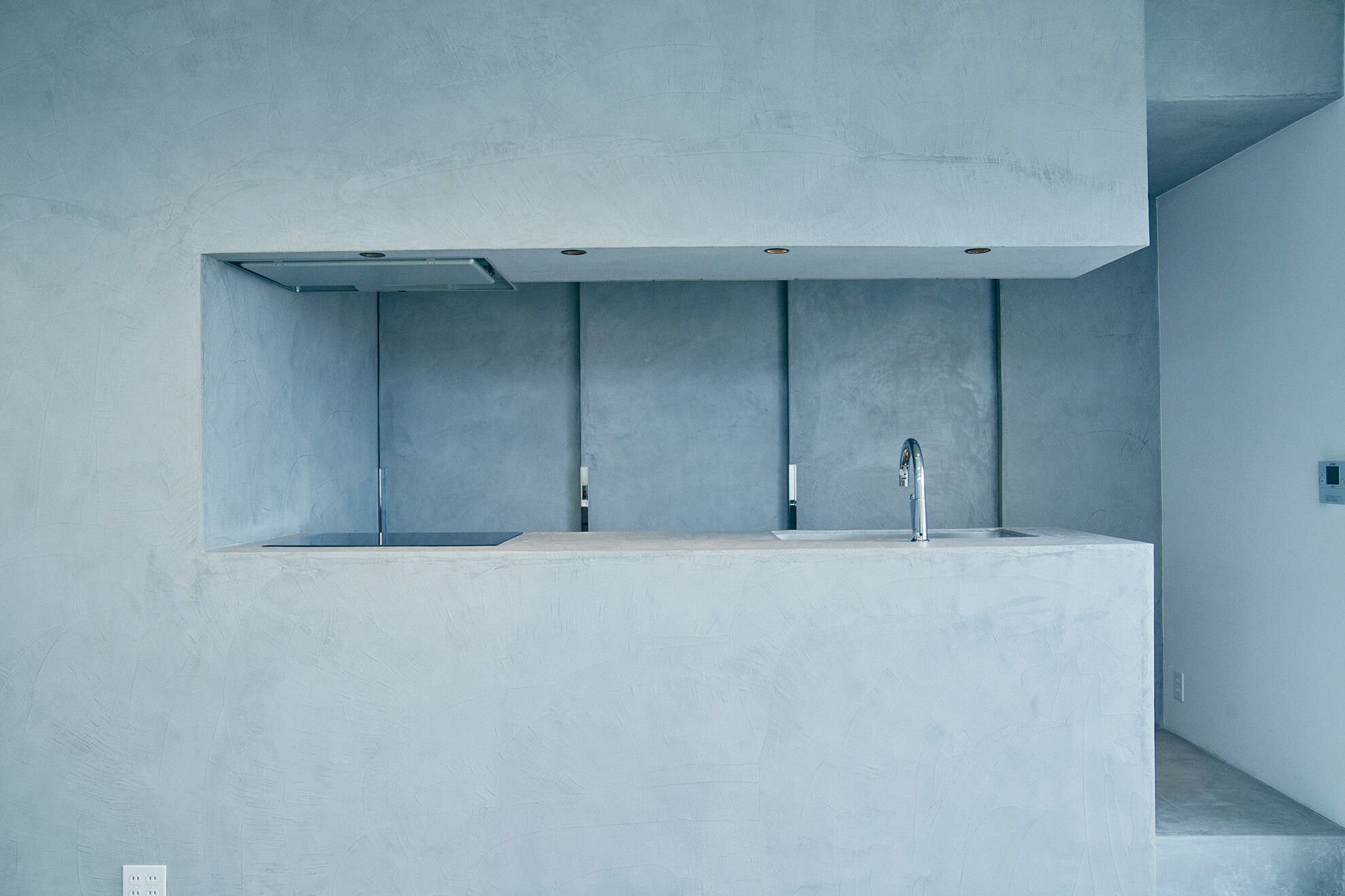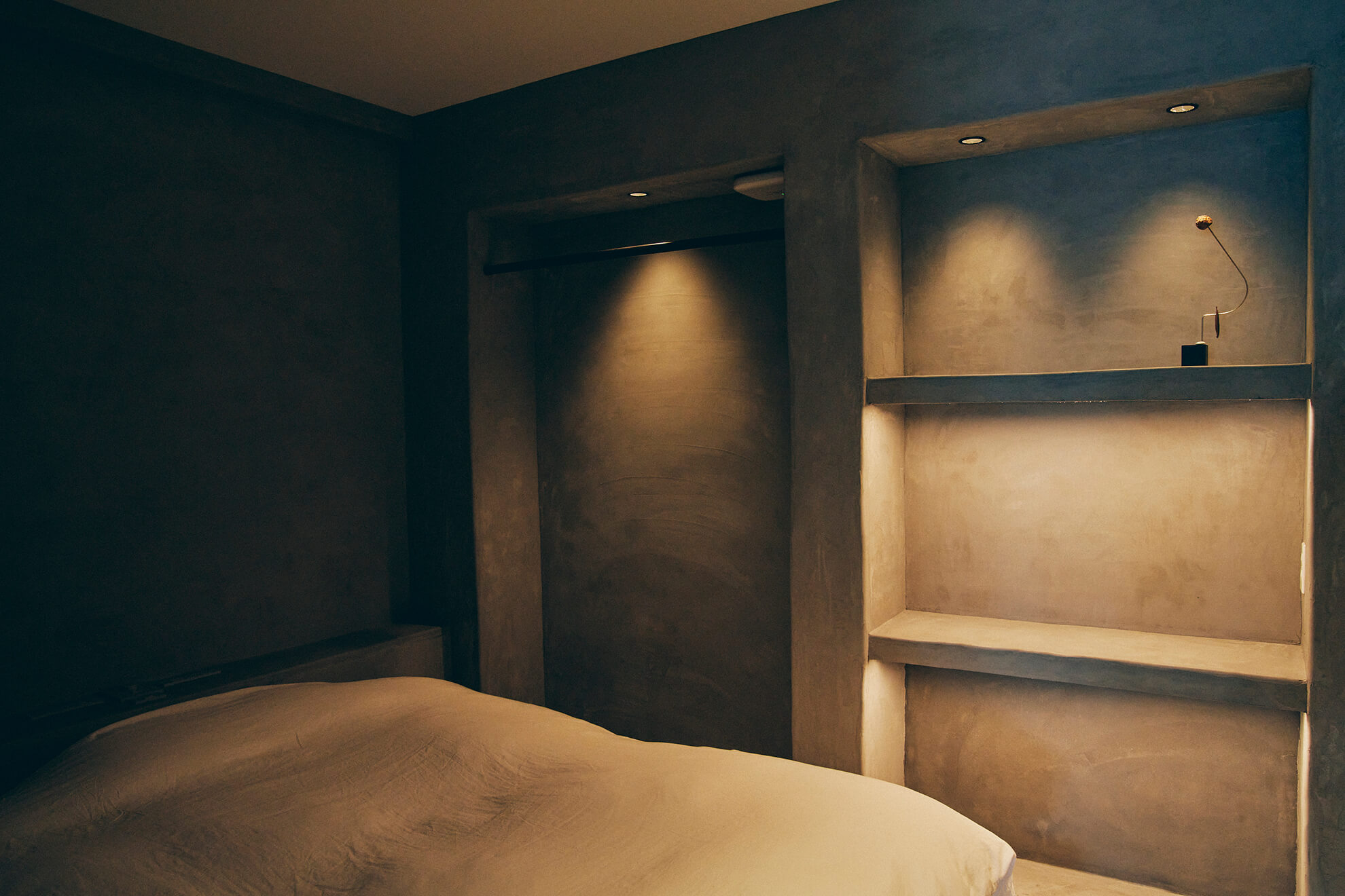 The bedroom, kitchen, and bathroom are unified by Mortex.