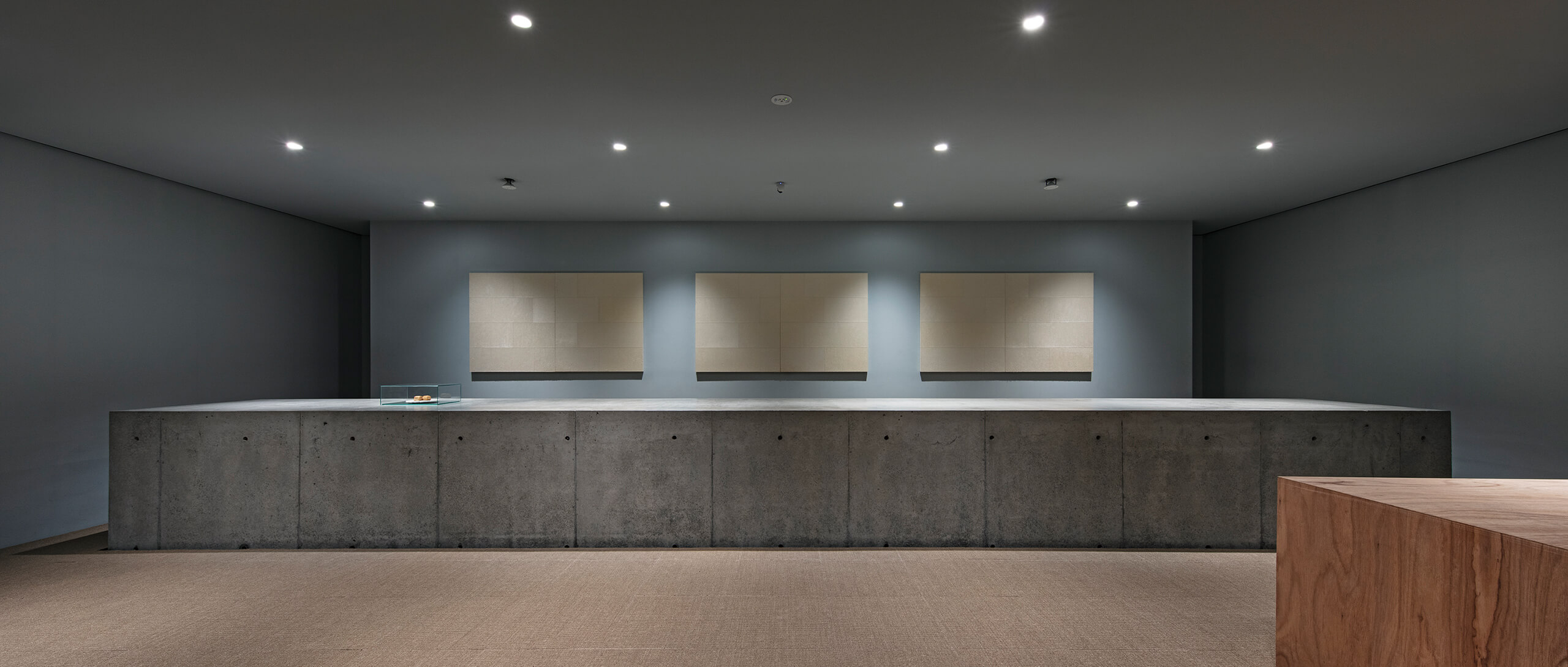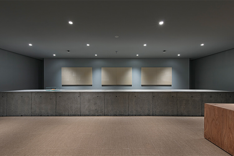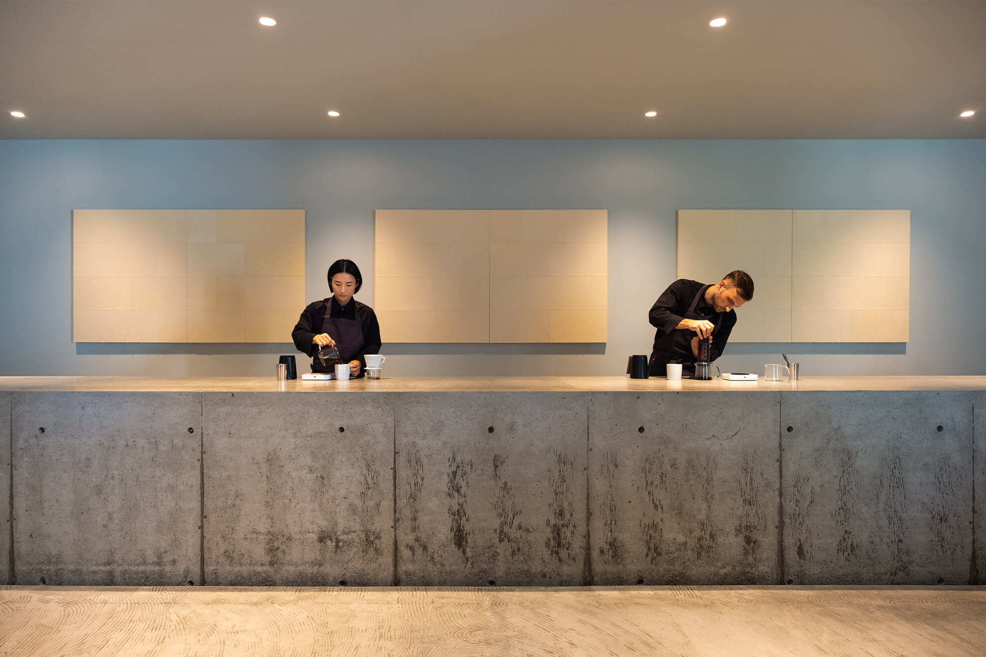 Given the nature of an experiential shop, the goal was to minimize clutter from tools and materials while directing the space design. All equipment is neatly stored within a concrete counter measuring approximately 9 meters in width. Coffee beans are displayed artfully behind doors covered with traditional Japanese paper, creating a more laboratory-like atmosphere compared to the Sakura-Shinmachi shop.